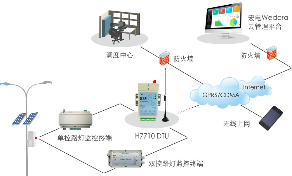 從2009年開(kāi)始,浙江省開(kāi)始陸續(xù)在各省市實(shí)時(shí)路燈智能控制工程。項(xiàng)目采用深圳宏電H7710 DTU設(shè)備,通過(guò)232/485和路燈監(jiān)控終端內(nèi)的PLC相連,內(nèi)插SIM數(shù)據(jù)卡通過(guò)GPRS網(wǎng)使得路燈監(jiān)控終端和數(shù)據(jù)管理中心形成網(wǎng)絡(luò)通信,實(shí)現(xiàn)數(shù)據(jù)管理中心遠(yuǎn)程監(jiān)控路燈運(yùn)行。
