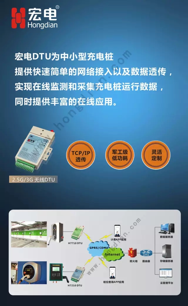 對(duì)于中小型充電樁,基于宏電DTU的通信聯(lián)網(wǎng)方案,可以提供快速簡(jiǎn)單的網(wǎng)絡(luò)接入及數(shù)據(jù)透?jìng)鳎瑢?shí)現(xiàn)在線監(jiān)測(cè)和采集充電樁運(yùn)行數(shù)據(jù)等功能,同時(shí)可以提供豐富的在線應(yīng)用。