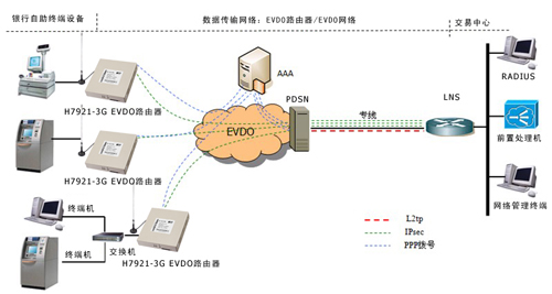 廣發(fā)銀行自助ATM通信網(wǎng)絡(luò)系統(tǒng)采用中國(guó)電信EVDO網(wǎng)絡(luò),并配置宏電H79213G路由器,終端通過(guò)3G網(wǎng)絡(luò)接入系統(tǒng)。同時(shí)系統(tǒng)采用各地市分行通過(guò)DDN專線接入網(wǎng)絡(luò),所有3G終端所采用的UIM卡申請(qǐng)電信的VPDN業(yè)務(wù),所有非VPDN業(yè)務(wù)的卡無(wú)法登陸專有網(wǎng)絡(luò),整個(gè)網(wǎng)絡(luò)結(jié)構(gòu)邏輯上與運(yùn)營(yíng)商的商用網(wǎng)絡(luò)是隔離的,以此保證數(shù)據(jù)通信的安全。