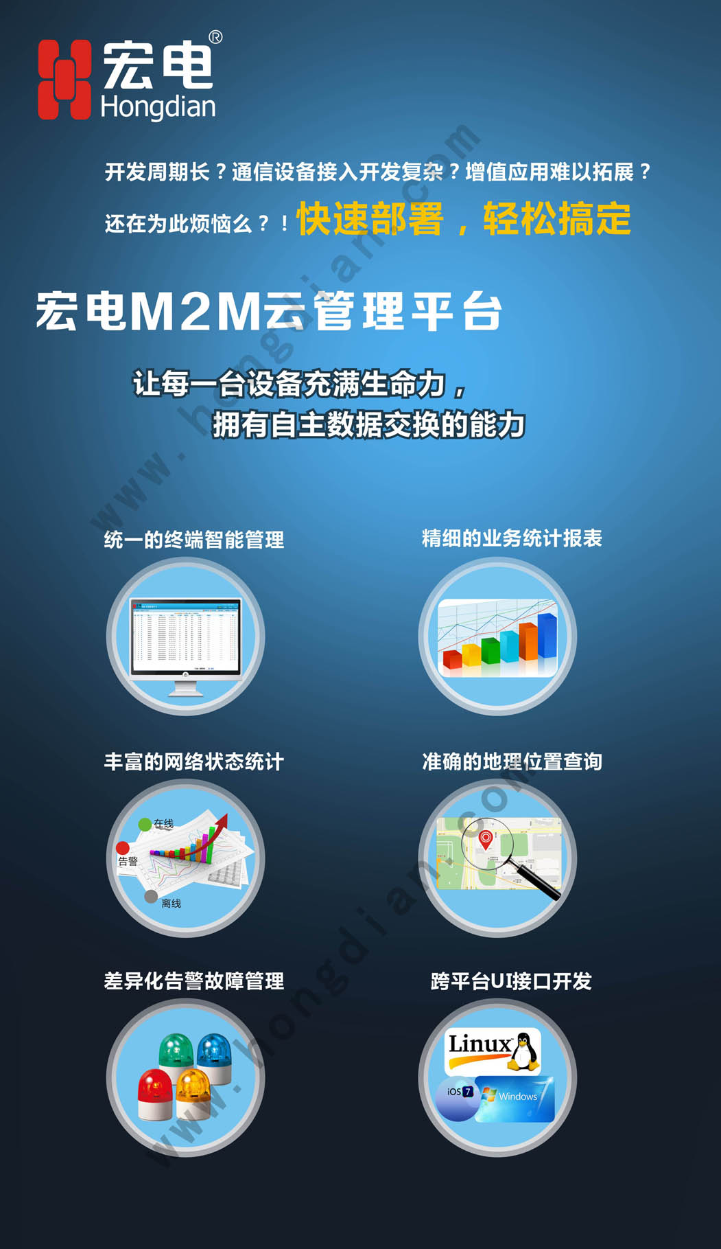 對于不具備開發(fā)實力或者開發(fā)成本較高的企業(yè),宏電還可以提供快速部署的M2M云管理平臺,實現(xiàn)設(shè)備的統(tǒng)一管理、精細統(tǒng)計、狀態(tài)統(tǒng)計、故障管理以及跨平臺開發(fā),讓每一臺設(shè)備都充滿生命力,擁有自主數(shù)據(jù)交換的能力。