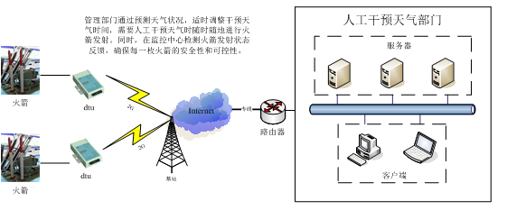 人工影響天氣火箭發(fā)射裝置有固定點(diǎn)火箭發(fā)射架和車載火箭發(fā)射架兩種,固定點(diǎn)火箭發(fā)射架主要安裝在遠(yuǎn)離城市的地方,車載火箭發(fā)射架則需要根據(jù)實(shí)際情況、旱情和冰雹預(yù)測(cè)進(jìn)行隨時(shí)機(jī)動(dòng)。火箭發(fā)射架上安裝的宏電DTU將火箭發(fā)射架的參數(shù)全部收集和回傳給數(shù)據(jù)中心,中心監(jiān)控人員通過對(duì)云層的觀察確定火箭的發(fā)射時(shí)間和發(fā)射方向,從而確保火箭彈頭可以準(zhǔn)確的到達(dá)預(yù)定云層,實(shí)現(xiàn)人工增雨的效果。宏電DTU的穩(wěn)定工作,保障了火箭發(fā)射的順利進(jìn)行,實(shí)現(xiàn)了人工增雨防雹工作,已成為國(guó)內(nèi)人工影響天氣的重要組成環(huán)節(jié)。