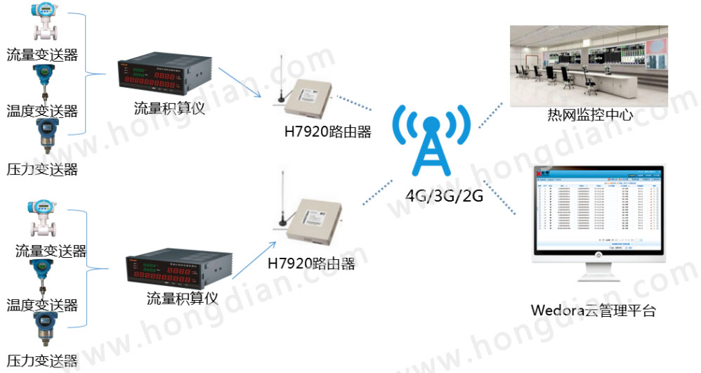 該系統由蒸汽流量測量儀器、宏電4G路由器、宏電Wedora云管理平臺組成,實時將蒸汽測量儀器商采集各熱用戶子站的溫度、壓力、流量運行參數通過宏電路由器H7920串口DTU功能發回給后臺熱網服務器,上位機實施對用戶數據的顯示、存儲、分析、處理,熱電廠管理人員可以遠程方式調閱熱網數據,實現數據共享,參與熱網管理。