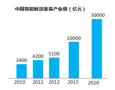 隨著我國制造業重點領域的智能化轉型進一步加快,智能制造裝備市場發展迅猛,中國制造2025發展規劃已經對“十三五”期間制造業促進政策作出布局——以智能制造為主導,通過其他政策進一步優化整體環境,為智能制造裝備產業全面升級創造有利條件,而規劃中提出的十大重點任務首要任務是“加快智能制造裝備發展”,以上可以看出智能制造裝備在智能制造產業發展中占據核心位置,據統計,到2020年我國智能裝備制造業產業將達到30000億元。