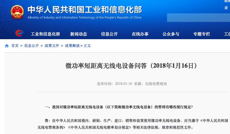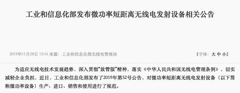 C114訊 11月29日深度報道(劉定洲)工業和信息化部無線電管理局昨日在官網發布公告指出,為適應無線電技術發展趨勢,深入貫徹“放管服”精神,落實《中華人民共和國無線電管理條例》,切實減輕企業負擔,近日,工業和信息化部發布了2019年第52號公告,對微功率短距離無線電發射設備生產、進口、銷售和使用進行了規范。