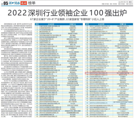 今日,由深圳市行業領袖企業發展促進會、深圳商報與讀創客戶端共同主辦的“2022深圳行業領袖企業100強”評選結果出爐,宏電股份憑借在5G工業通訊終端產品領域的卓越成就,成功入選。