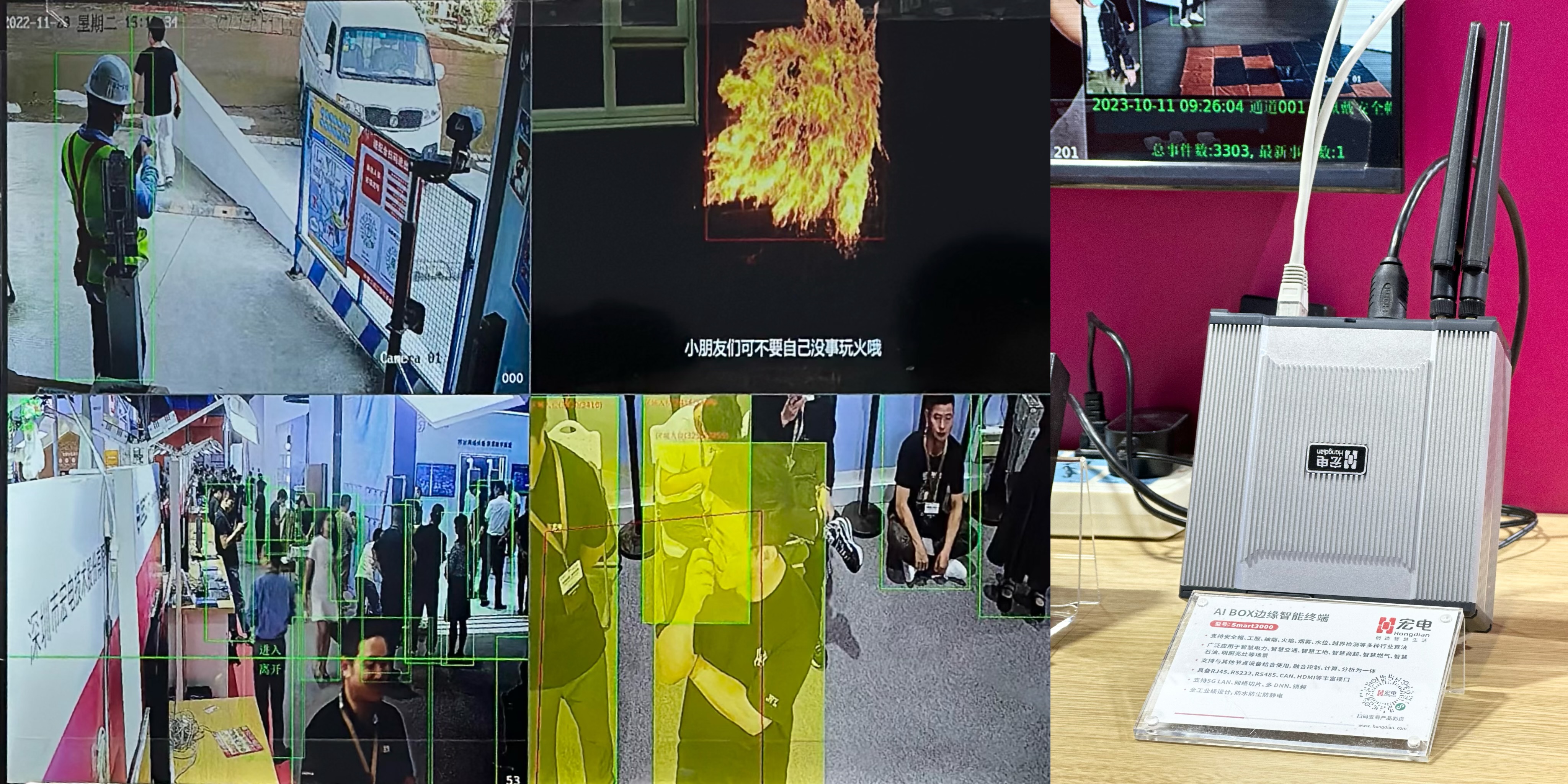 算力已成為數(shù)字經(jīng)濟(jì)時(shí)代的關(guān)鍵生產(chǎn)力,是全社會(huì)數(shù)字化、智能化轉(zhuǎn)型的重要基石。宏電股份順應(yīng)算力時(shí)代,推出AI BOX邊緣智能終端,開拓物聯(lián)網(wǎng)應(yīng)用新場(chǎng)景。并在展會(huì)現(xiàn)場(chǎng)借助AI BOX的高算力分析能力在現(xiàn)場(chǎng)搭建AI算法識(shí)別演示系統(tǒng),展示了人流量統(tǒng)計(jì)、區(qū)域入侵識(shí)別、火焰識(shí)別、跌倒識(shí)別、安全帽工衣識(shí)別等多種行業(yè)算法,探索更廣泛的AI應(yīng)用落地場(chǎng)景和解決方案。