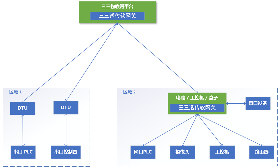 在圖中,區(qū)域 1 的設(shè)備通過 DTU 將串口信號轉(zhuǎn)為 TCP 流,實現(xiàn)了和平臺上的透傳軟網(wǎng)關(guān)通信。在區(qū)域 2 中的局域網(wǎng)中,部署了一個透傳軟網(wǎng)關(guān),其具備的串口、網(wǎng)口通信能力讓它可以和局域網(wǎng)中的所有設(shè)備通信。另外,我們需要在三三平臺上配置了一些透傳規(guī)則。這樣組網(wǎng)后,區(qū)域 1 和 區(qū)域 2 的所有設(shè)備相互之間,都可以實現(xiàn)互相通信。