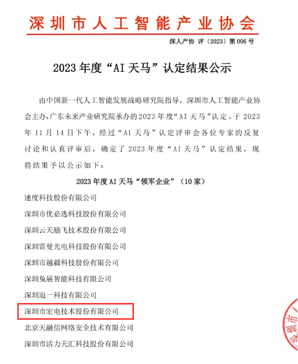 近日,由中國新一代人工智能發(fā)展戰(zhàn)略研究院指導(dǎo),深圳市人工智能產(chǎn)業(yè)協(xié)會(huì)主辦,廣東未來產(chǎn)業(yè)研究院承辦的2023年度“AI天馬”認(rèn)定最終結(jié)果公布,宏電股份榮獲AI天馬“領(lǐng)軍企業(yè)”獎(jiǎng)項(xiàng)。