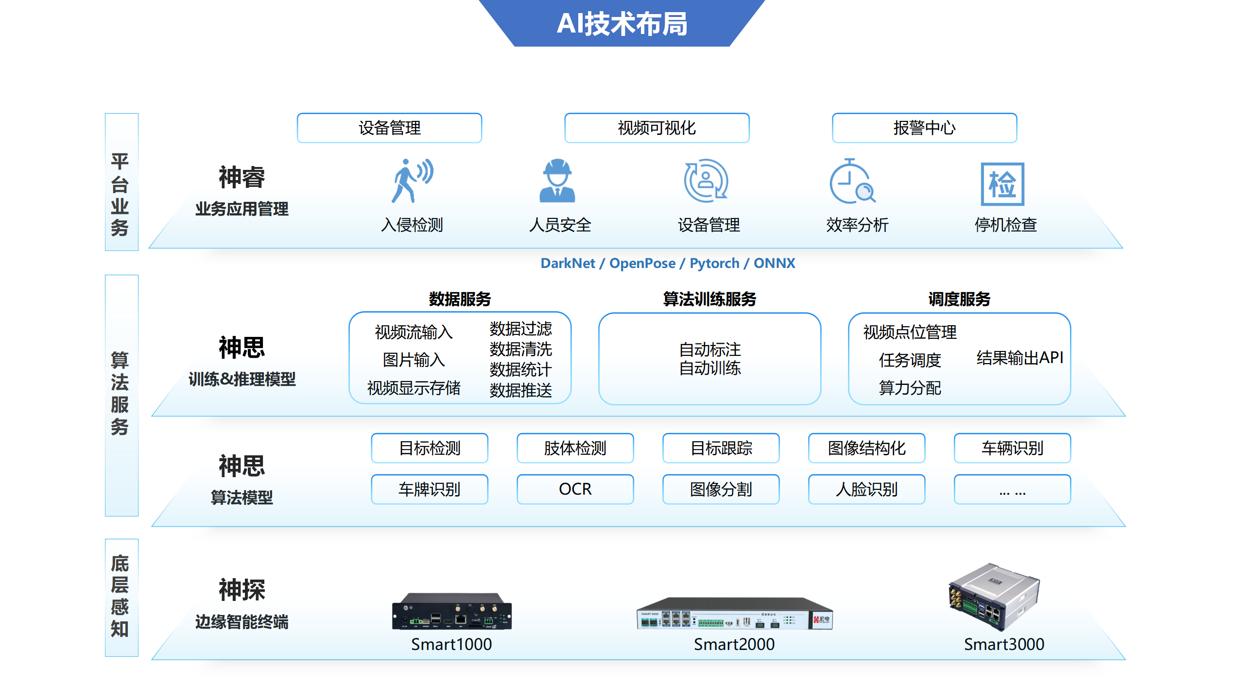 宏電股份基于20余年的技術(shù)沉淀,在工業(yè)AI方面有著豐富的積累,目前已經(jīng)完成人臉識別、安全帽工作服識別、車牌識別、抽煙識別、打電話識別、跌倒識別等多種AI算法,建立了自己的算法庫。不僅如此,宏電股份具備AI快速交付的能力,得益于其特有的3大塊AI能力:“神探”邊緣智能終端、“神思”人工智能算法訓(xùn)練&推理模型、“神睿”業(yè)務(wù)應(yīng)用管理平臺。3大AI能力的業(yè)務(wù)支撐,將數(shù)據(jù)的采集、標(biāo)注、訓(xùn)練、部署、優(yōu)化、測試、交付一整套鏈路全部打通,滿足AI智能分析場景碎片化、交付快速化的特殊要求。