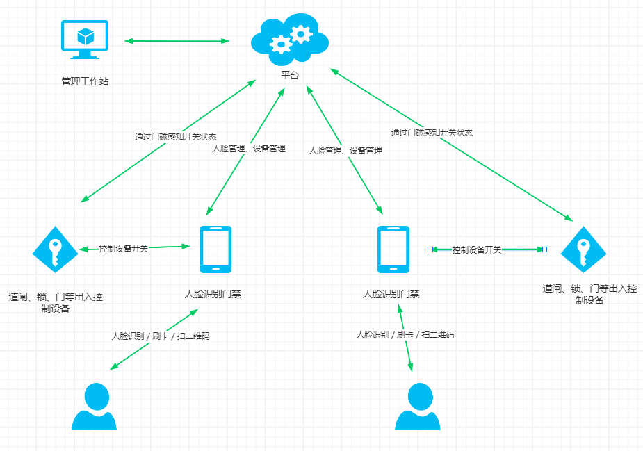 人臉識別門禁機:是智能門禁系統的主要設備,負責提供用戶的身份驗證和門禁控制的功能,門禁機本地有人臉庫,支持在本地進行人臉識別、快速和準確的發送開門信號到閘機或鎖,同時與云平臺進行數據交互,上報通行記錄,接受云平臺管理。