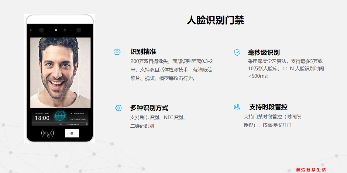 功能強大:可通過人臉識別、二維碼掃描、IC卡刷卡、平臺/小程序控制等多種方式,實現準確的用戶的身份驗證和門禁控制。還可以實現訪客的預約、登記和授權等功能。