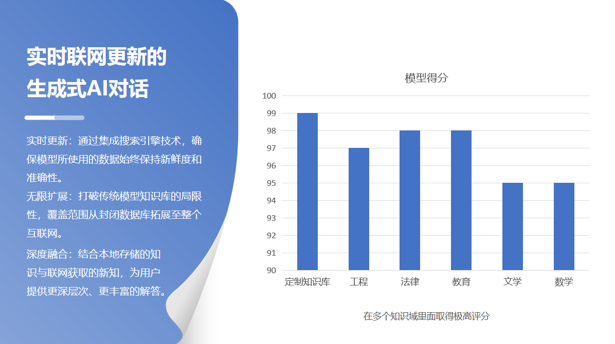 在生成式對話方面,凝思大模型不僅支持通用模型的對話互動、自由問答、文案創作等能力,更能通過集成先進的搜索引擎技術,實現知識庫的實時聯網更新,確保模型所引用的數據始終保持新鮮度和準確性,為用戶提供更深層次、更豐富的解答。此外,凝思大模型也在工程、法律、教育、文學、數學等多個知識域里面取得極高評分。