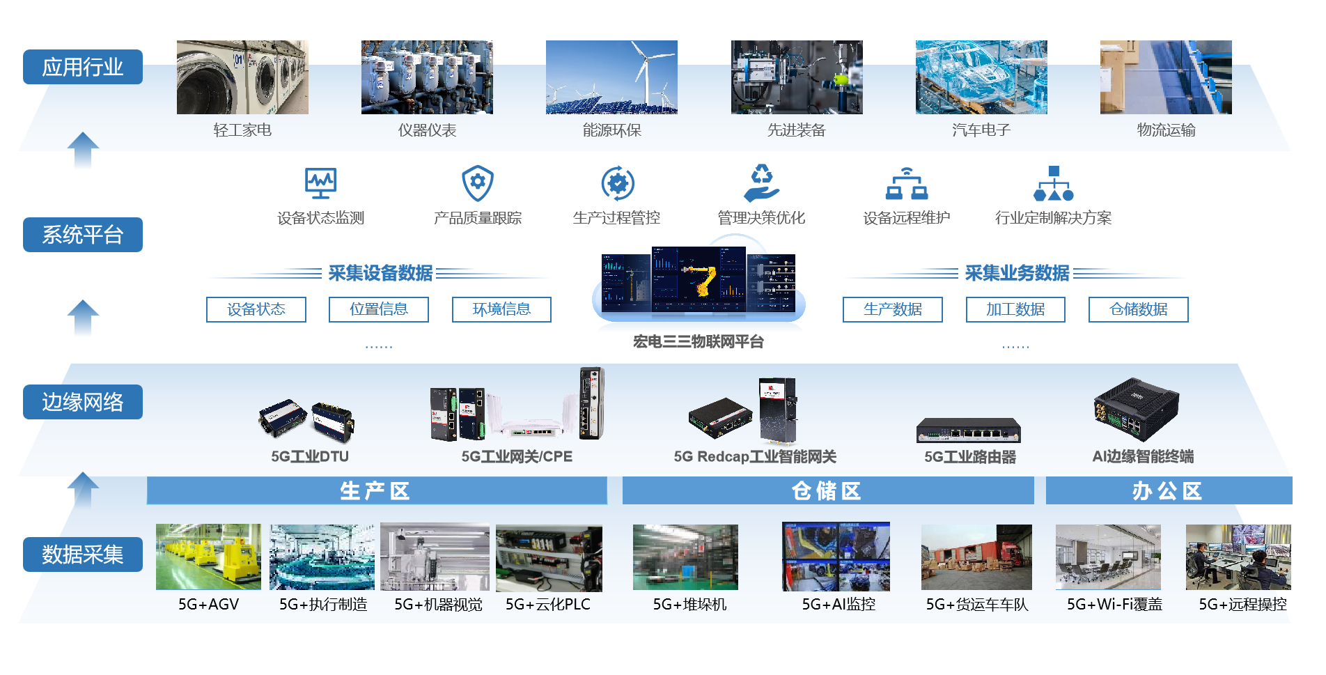 在工業互聯網方面,宏電股份重點解決OT和IT融合的問題,提供設備聯網、協議解析、數據采集、數據處理、平臺運維、能耗管理等完整的工業互聯網解決方案。例如,在生產區可實現工業裝備遠程運維、PLC之間協同工作、機器視覺高清圖片視頻高速傳輸等應用;在倉儲區則可以做到AGV互聯互通、移動設備無線聯網,確保終端在移動過程中業務不中斷;在園區中通過WiFi Mesh同頻組網,實現工廠5G網絡全覆蓋,數據不出廠。