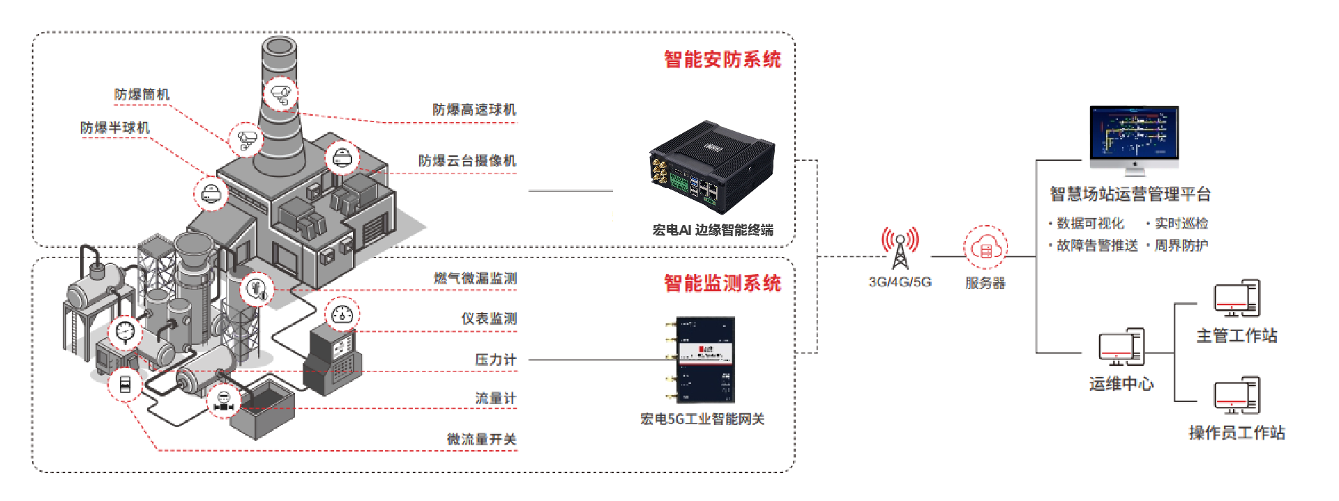 宏電5G工業網關具備強大的邊緣計算能力,能夠實現多品牌、多型號、多協議類型燃氣流量計的數據采集與解析,實現對壓力、流量、可燃氣體等傳感器數據實時監測。通過部署AI邊緣智能終端對油氣場站內視頻數據進行人臉、工服安全帽、吸煙打電話、火焰煙霧等Al分析識別,對場站的出入口、周界管理做到巡檢有計劃、過程有監督、事后有分析、數據可視化。助力企業實現智慧化運營,讓看不見的風險實時可見,切實守護城市安全生命線。