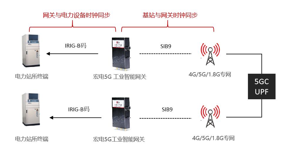 智能配網站所終端DTU裝置通過網口接入宏電5G工業網關,網關通過SIB9消息獲取當前時鐘信息,再以IRIG-B碼的方式脈沖到電力終端,兩臺網關輸出時間差僅為10us左右,通過網關高精度授時的點到點雙向通信網絡來保證數據高速傳輸,幫助差動保護裝置快速定位隔離故障,完成故障自愈,實現配網差動保護業務。