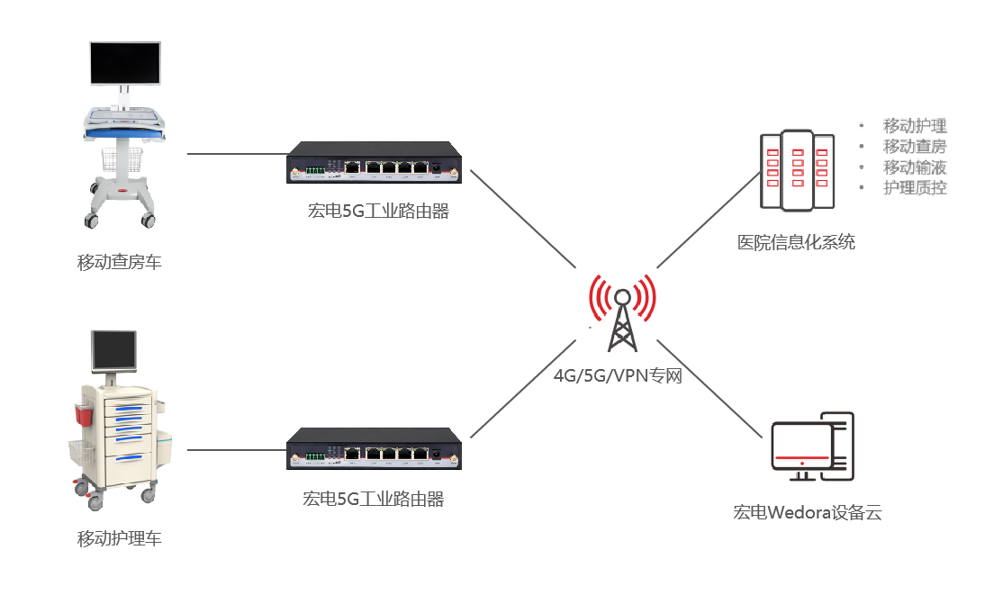 通過在移動護理車、查房車上部署5G工業路由器,以5G/4G APN專網為數據交互載體,醫護人員可實時接入院內診療系統,與院內患者的電子病歷信息系統實時交互,患者檔案或醫療高清影像可秒速加載,實現醫院內外信息實時共享。