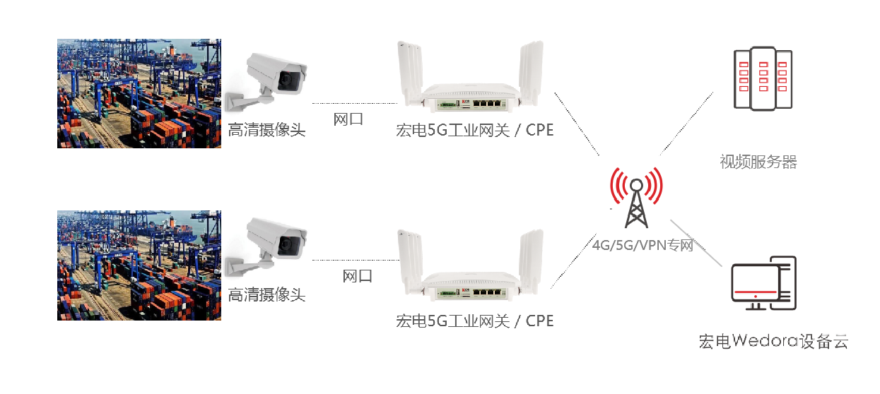 在港口集裝箱碼頭部署宏電5G工業CPE搭建遠程監控系統,通過遠程高清視頻方式實時查看龍門吊現場工作情況,減少人員定期攀爬龍門吊查詢視頻帶來的安全風險,同時利用5G網絡的高速特性,后端安全管控人員可以實時調用前端畫面,當發現有異常情況時立即呼叫,將安全隱患遏制在萌芽階段。