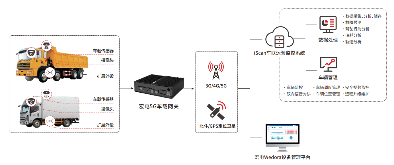 宏電車載網關為車輛提供高速安全的5G/4G網絡,通過豐富的接口將車載攝像頭、調度終端、車載機頂盒等設備統一接入網絡,實現對貨運車輛的規范管理和統一調度,提高車輛運營效率,對駕駛員的不安全駕駛行為做到實時監管,并過語音對講的方式做到實時提醒,減少事故發生的概率。