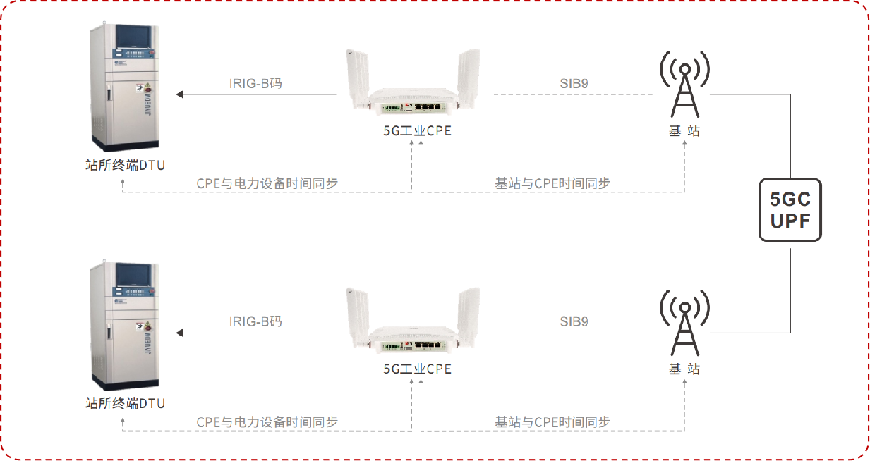 基于宏電5G工業智能網關/CPE的線路差動保護解決方案通過在兩端的站所終端DTU上部署5G工業智能網關/CPE,構建5G高速網絡實現終端間的互聯互通;5G基站通過GPS/北斗衛星獲取精準定時,與標準時間進行同步后,宏電5G工業智能網關/CPE通過空口SIB9消息獲取當前精準時鐘信息,再通過IRIG-B碼的方式脈沖到站所終端DTU,站所終端DTU在接收到數據后解析B碼信息,獲取標準時間,從而實現各裝置之間以及現場裝置與主站間的時鐘同步,實現點對點快速傳輸,完成故障自愈。