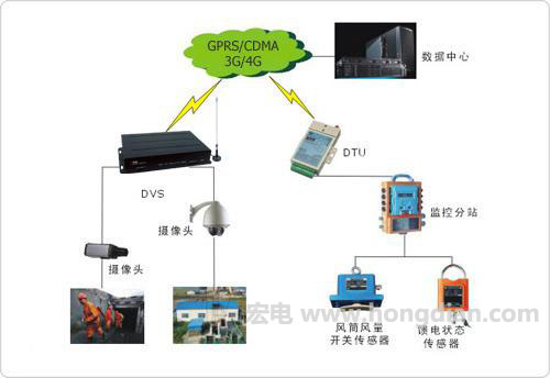 該系統(tǒng)使用宏電DVS設(shè)備實現(xiàn)監(jiān)控功能,適用于檢測礦井下的環(huán)境參數(shù)與各種生產(chǎn)參數(shù),通過無線方式將井下數(shù)據(jù)傳輸?shù)娇刂浦行臋C房,實現(xiàn)對井下數(shù)據(jù)的實時采集、處理、存儲、顯示與報警。包括工作面的圖像、煤層濕度、空氣瓦斯?jié)舛取L(fēng)機運作狀態(tài)的數(shù)據(jù)都可以在監(jiān)控中心實時表現(xiàn)出來。
