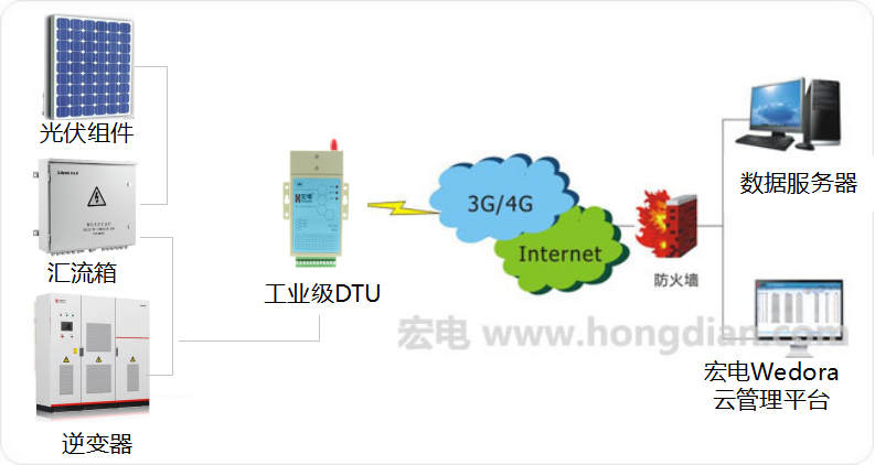 通過宏電無線數傳終端采集逆變器、匯流箱、儲能站、輻照儀、氣象儀、電表等各類數據,并通過3G/4G/5G/RedCap網絡上傳至光伏電站能效管理系統(tǒng)進行數據統(tǒng)計分析與展示,實現分布式光伏場站的透明化管理、自動化運維。