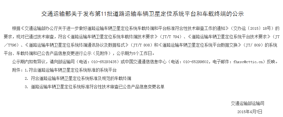 2015年4月7日,交通部對第11批已通過技術審查的車載終端及平臺進行了公示,包含符合《道路運輸車輛衛星定位系統車載終端技術要求》(JT/T 794)和《道路運輸車輛衛星定位系統終端通訊協議及數據格式》(JT/T 808)的車載終端以及符合《道路運輸車輛衛星定位系統平臺技術要求》(JT/T796)和《道路運輸車輛衛星定位系統平臺數據交換》(JT/ 809)的系統平臺。