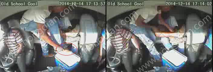 圖為歹徒乘機竄上車并挾制司機,紅圈標記為歹徒所持手槍