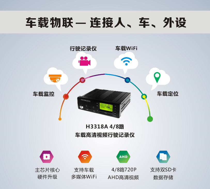 H3318A還內置車載WiFi模塊,可提供免費WiFi上網服務以及本地存儲的豐富的視頻、音樂、游戲等,在實現安全監控外,更多了途中享受,實現了人與車的互聯。