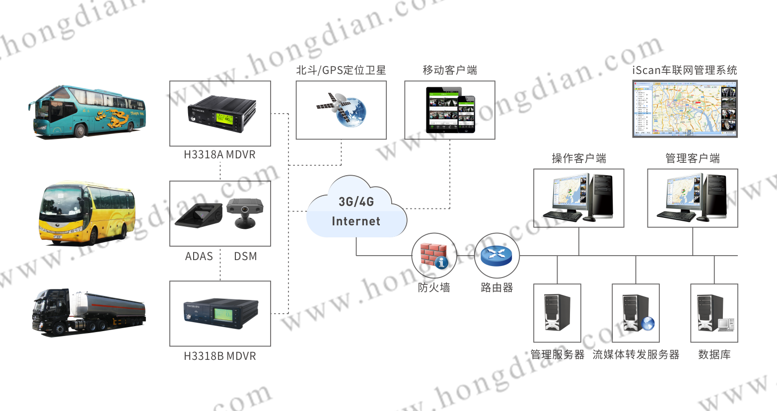該系統主要由宏電車載硬盤視頻行駛記錄儀H3318B-L、高清車載專用攝像機、云南省運營監管平臺、宏電iScan車聯網管理平臺等組成。