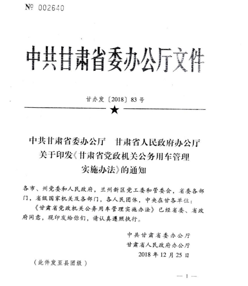 為了規范全省黨政機關公務用車管理,甘肅省于2018年12月發布《甘肅省黨政機關公務用車管理實施辦法》,要求各類公務車納入平臺集中管理,安裝定位設備,采用信息化手段統籌調度、高效使用。