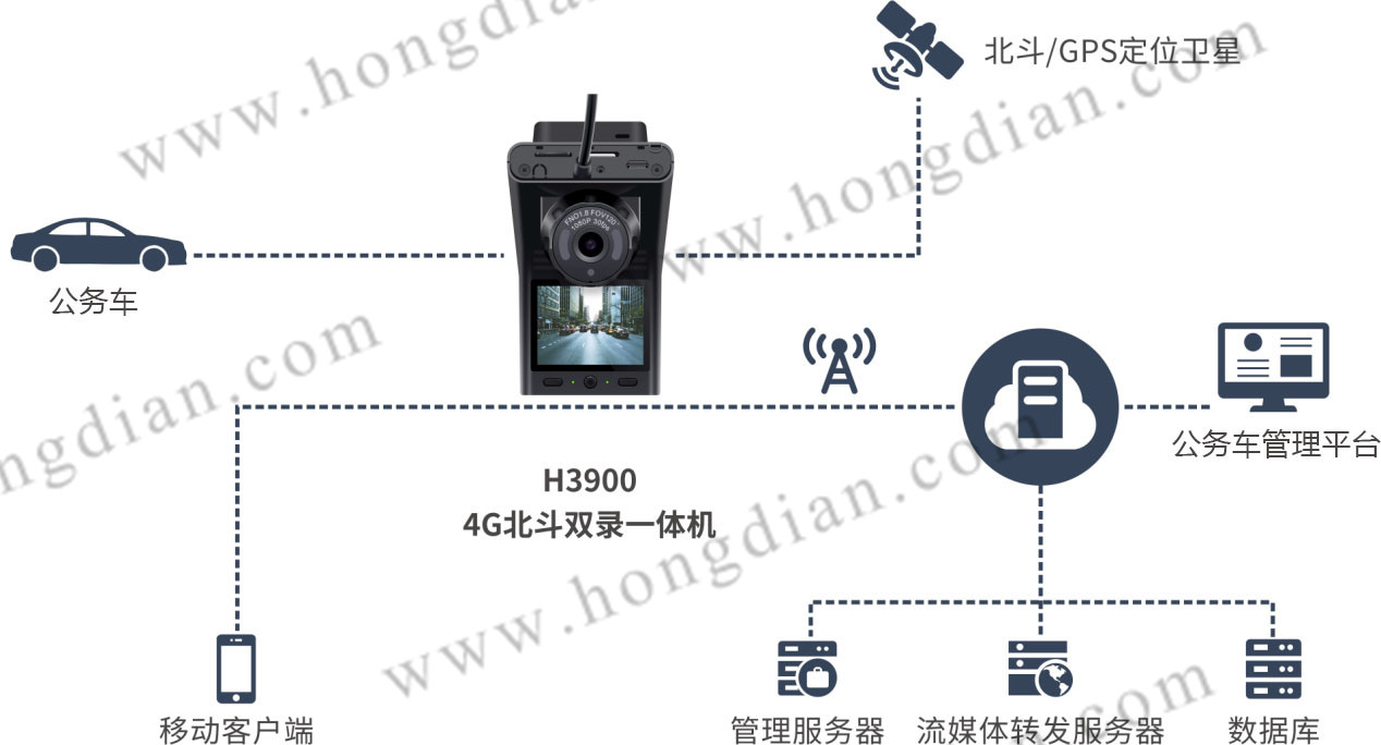 H3900 4G北斗雙錄一體機通過GPS/北斗模塊采集車輛數據,含車輛實時的位置和速度、車輛狀態(剎車、遠近光燈、左右轉燈)、設備觸發的一系列報警數據(超速報警、緊急報警、視頻遮擋等),通過SIM卡4G網絡實時上傳至蘭州市公務用車管理平臺。