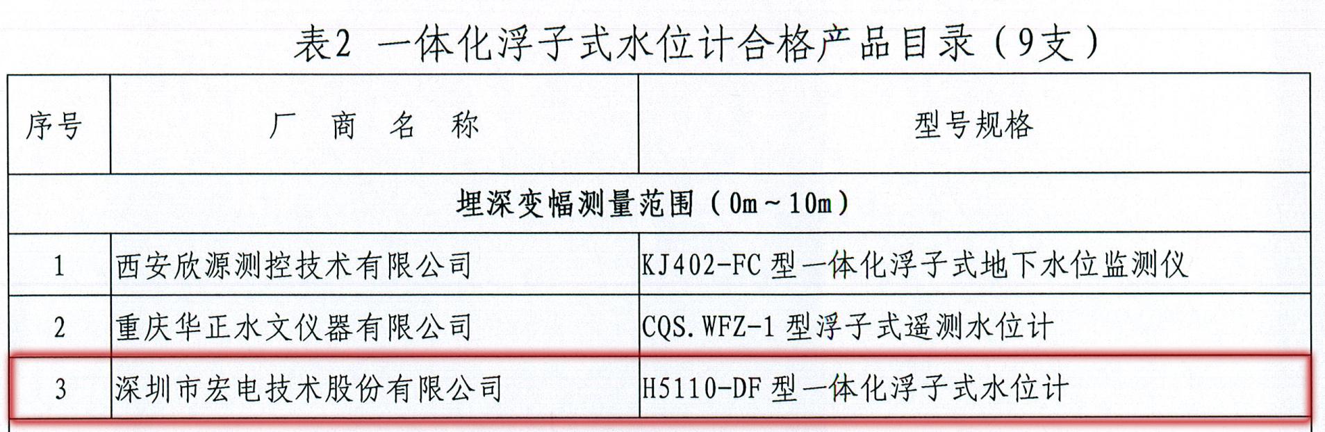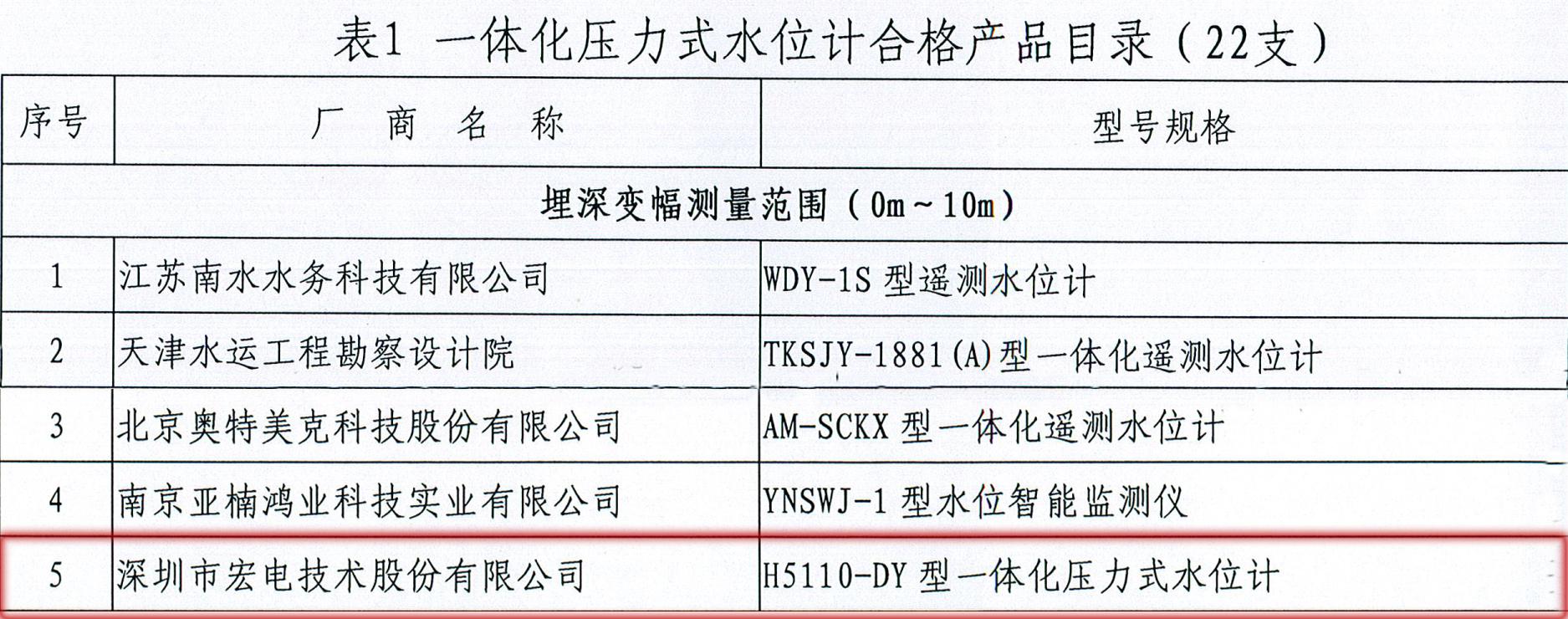2015年5月,深圳市宏電技術股份有限公司的一體化壓力水位計(型號:H5110-DY)和一體化浮子式水位計(型號:H5110-DF)兩款類型的產品同時通過檢測,成為首批入圍水利部水文及巖土工程儀器質量監督檢測中心發布的《地下水位監測儀器設備檢測合格產品目錄》。