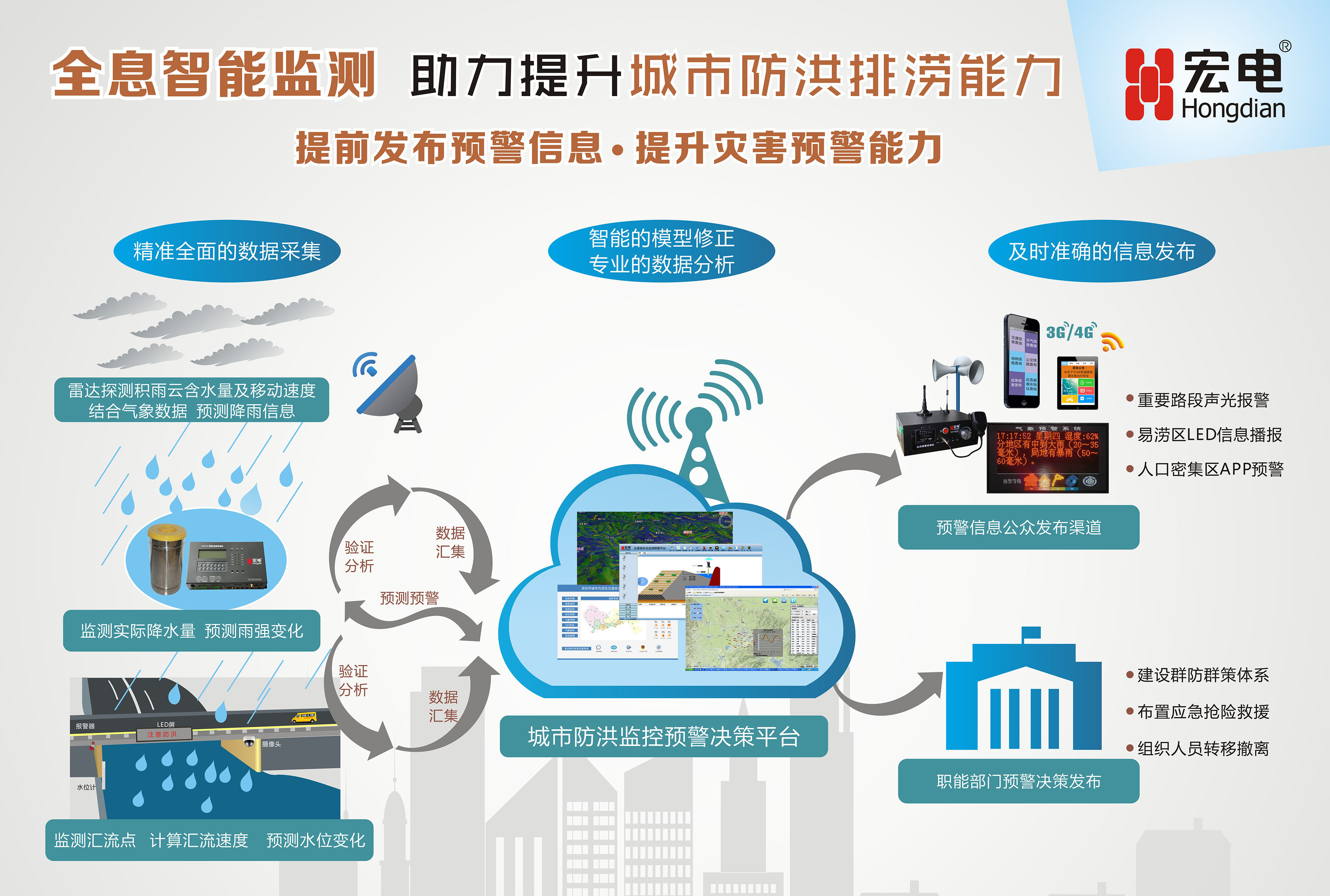 工程中心依托宏電十幾年在智慧水利領域的成熟經驗,通過全息智能監測預警系統,提升城市防洪排澇能力,在確保城市排水防澇安全的前提下,統籌自然降水、地表水和地下水的系統性,協調給水、排水等水循環環節,最大限度地實現雨水在城市區域的積存、滲透和凈化,促進雨水資源的利用和生態環境保護。