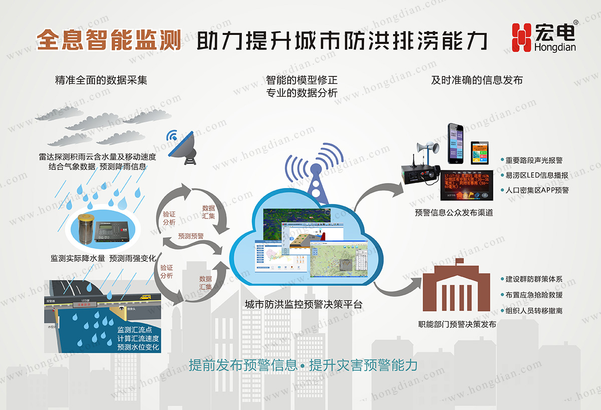 實踐中,深圳宏電正踐行著這樣的理念,推出了城市內澇積水監測系統,該系統整合空間信息、土地利用信息、管網信息和實時監測的水位、雨量、水質、流量等信息,通過精準全面的數據采集,智能的模型修正,專業的數據分析,及時準確的信息發布,實現城市內澇積水情況的監測和預報,為管理部門提前發布預警提供支持,助力海綿城市的建設。