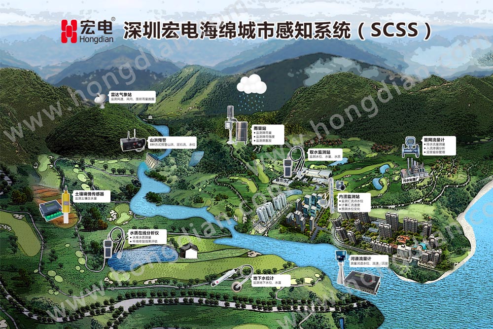 鑒于監測數據和模擬仿真技術對于城市規劃、建設、運行的重要性,深圳宏電基于新型的測量傳感設備,合理布設各類海綿體監測站點,依托城市水文模擬仿真軟件,通過物聯網、云計算和大數據平臺,構建宏電海綿城市感知系統(Sponge City Sensing System,縮寫為SCSS),完成對城市水循環過程的全方位立體監控,解決“有多少水、水在哪里、往哪里去”的問題。