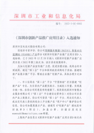近日,深圳市工業(yè)和信息化局公布《深圳市創(chuàng)新產(chǎn)品推廣應(yīng)用目錄(2022年第三批)》,經(jīng)深圳市工信部門組織專家評(píng)審一致認(rèn)可,宏電股份申報(bào)的智能采集器、智能水位監(jiān)測(cè)站憑借核心技術(shù)力強(qiáng)和市場(chǎng)推廣效果好等突出優(yōu)勢(shì)成功入選,并成為政府機(jī)構(gòu)采購?fù)扑]產(chǎn)品。
