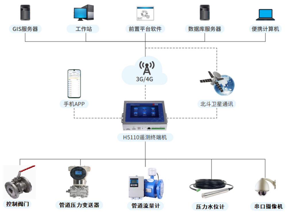 2、宏電H5110遙測終端機支持多種工業協議,對上向平臺提供數據,對下可以感知和控制設備,由平臺下發指令控制閥門的開合狀態,同時感知壓力計、流量計的數據情況,實現供水場景一體化的監測管理。可根據要求設置報警條件,當輸水管道出現壓力異常立即報警,流量為0時顯示流量異常報警,有效保障整個供水鏈路安全運行。