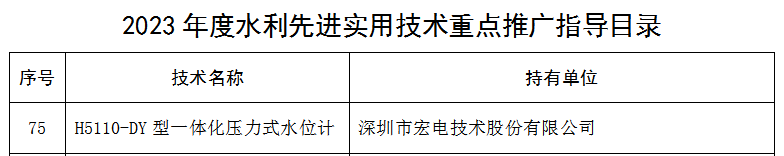 日前,水利部科技推廣中心公布了《2023年水利先進實用技術重點推廣指導目錄》,共239項水利先進實用技術入選,宏電股份自主研發的智能感知監測產品H5110-DY一體化壓力式水位計憑借“科學的技術原理、先進有效的技術性能指標、合理的成本價格和良好的應用效益”等優勢位列其中。