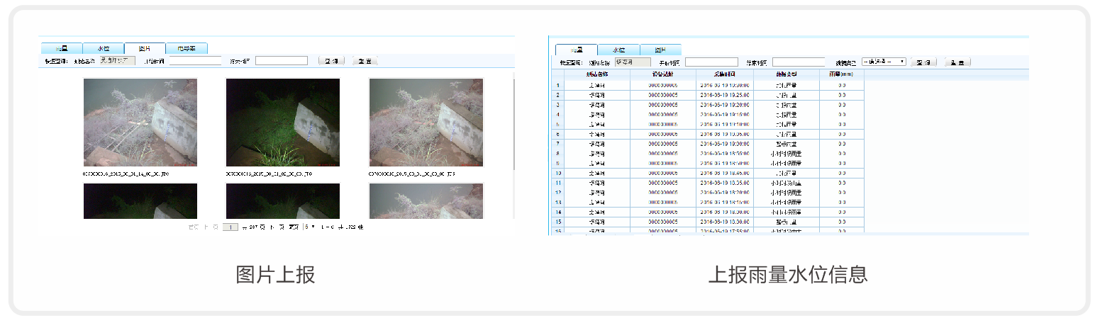 RTU可以定時(shí)對(duì)監(jiān)視的場(chǎng)景進(jìn)行拍照,然后將照片通過無線傳輸功能上報(bào)給平臺(tái)軟件,使平臺(tái)軟件可以將圖片、雨水情監(jiān)測(cè)量一起關(guān)聯(lián)查看,及時(shí)了解現(xiàn)場(chǎng)真實(shí)情況。