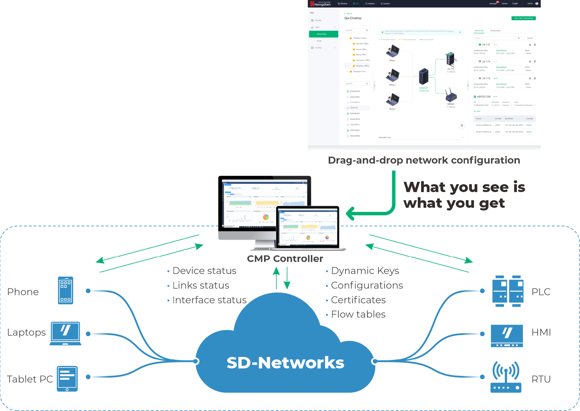 SD-WAN Networking Service simplified networking solution by Hongdian SDN(software-defined network) to quickly create private networks for branches. Allows you to access any Hongdian device and connected end-devices, whether they utilize SIM cards, Ethernet cables, or WiFi connectivity.