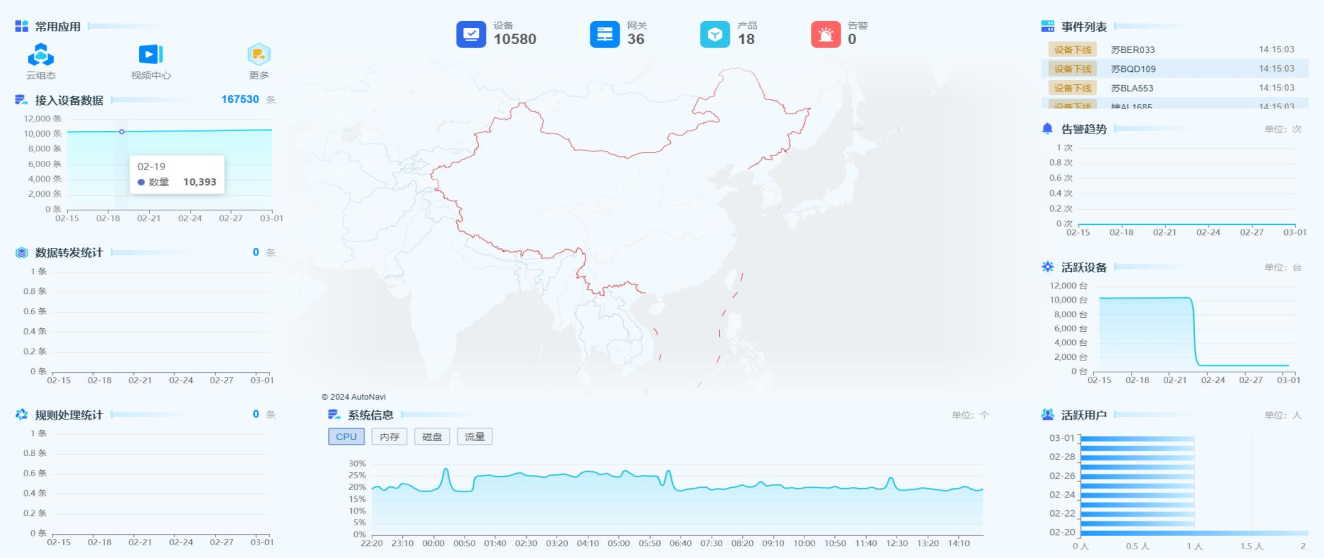 A graphic global display, including the total number of access devices in the whole plant, data forwarding statistics, alarm events, and alarm trends, support for adding, deleting, changing, and checking all the monitoring, surveillance, governance, and other front-end hardware equipment ledger information.