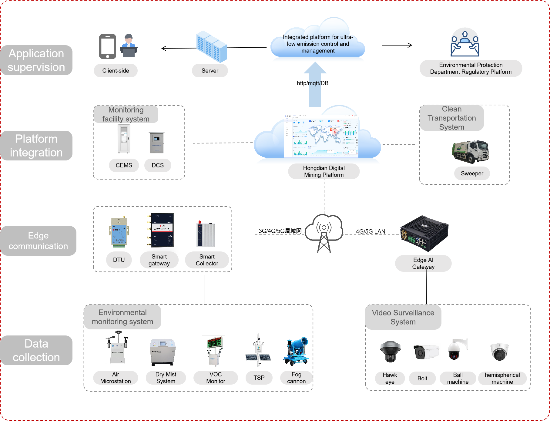 It builds a centralized data collection system through intelligent communication terminals such as Hongdian intelligent gateway, DTU, intelligent controller, and SanSan IoT cloud platform, establishes data governance rules and processes, and effectively ensures the consistency, completeness, accuracy, and security of plant data. It opens up the data of CEMS and DCS to realize the data linkage of the whole process monitoring of organized emissions, three-dimensional networked intelligent monitoring of disorganized emissions, and intelligent linkage management system and clean transportation system. It provides open interfaces such as MQTT/HTTP/DB to realize data sharing and synergy of the integrated application system of control and governance.