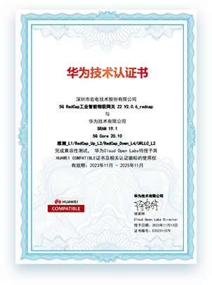 Hongdian Z2 V20 5G RedCap Industrial intelligent Gateway took the lead in passing a series of strict verification processes of Huawei OpenLab and completed the compatibility test based on Huawei RedCap terminal scenarios. The first HUAWEI COMPATIBLE certificate and its related certification logo granted by Huawei Cloud Open Labs.