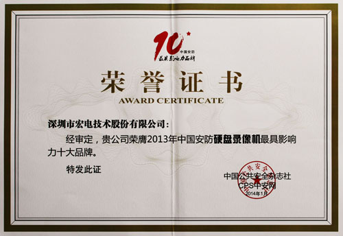 宏電喜獲“2013年中國安防最具影響力十大品牌”