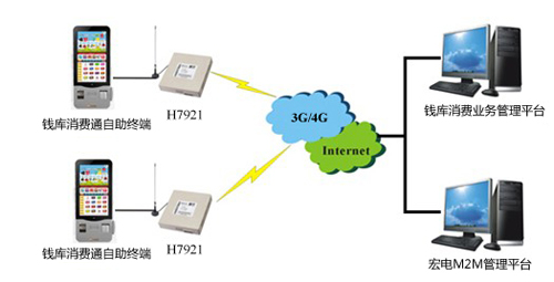 宏電錢庫消費通自助終端系統由錢庫消費通自助終端機、宏電H7921路由器和后端管理平臺三部分組成。其中,宏電H7921路由器用于構建3G/4G無線聯網系統,用于實現營銷廣告,消費信息,消費業務自助辦理等數據交互服務。