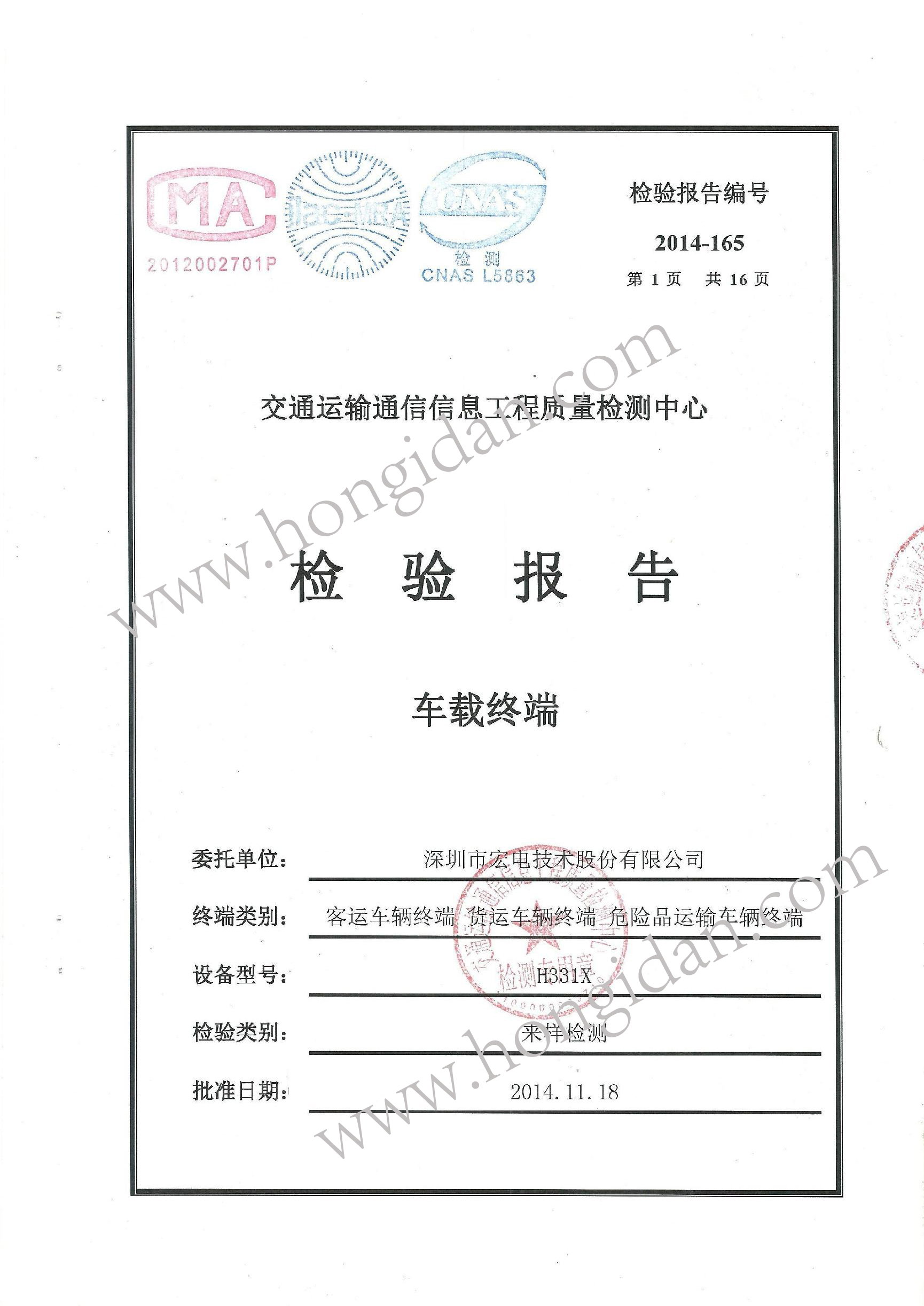 2014年12月交通部檢測結果公示,宏電H3318車載視頻行駛記錄儀成通過交通部兩大標準檢測的車載終端之一,同時還是目前既通過以上兩大標準又符合交通部JT/T 794車載視頻終端技術要求報批稿的視頻行駛記錄儀產品,確立了該產品在同類產品中的領航地位,展現了宏電公司敏銳的市場洞察力和雄厚的研發實力。