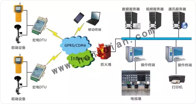 深圳宏電自2012年開始與全國各地環保監測項目供應商建立起戰略合作伙伴關系,為各地環保局量身打造了適用于PM2.5(霧霾)監測的無線聯網方案。該系統由1個中心站和n個子站構成:通過宏電通信無線數據傳輸單元DTU,實現各采集點采集終端(子站)與GPRS無線網絡的連接,將數據傳送至數據中心(中心站),以實現數據從終端到數據中心,以及數據中心到終端的雙向通訊。同時,系統還可以對每一個采集點的數據進行分析,使用戶通過圖表和曲線實時看到每一個采集點的數據變化趨勢,以便對不同的子站進行有效的管理。
