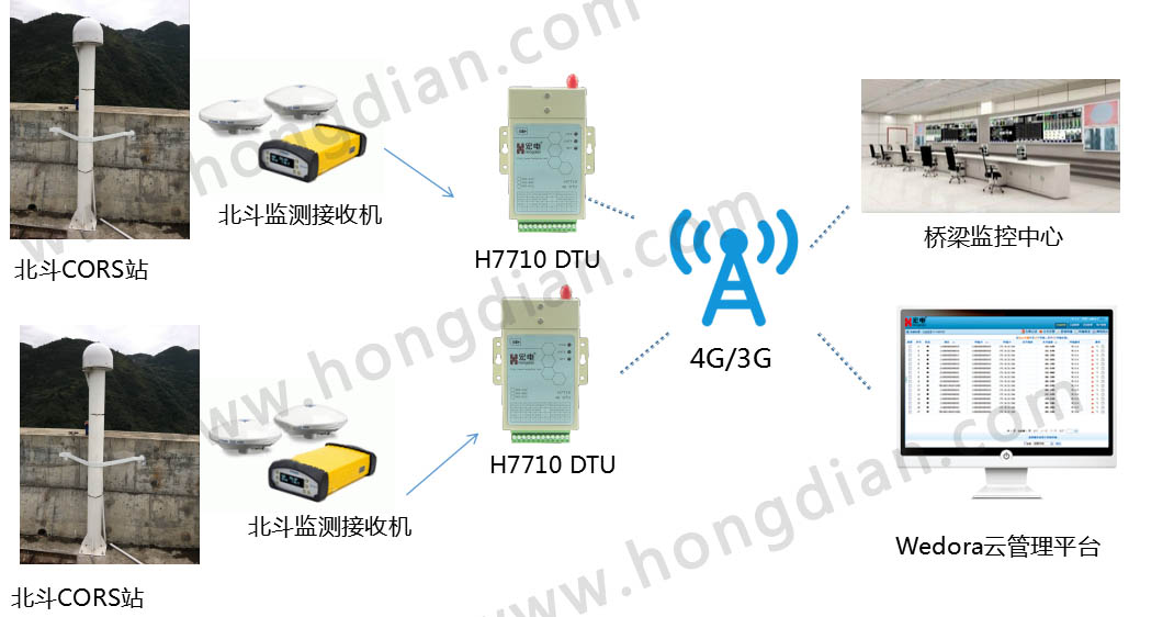 北斗橋梁形變監測系統主要由北斗橋梁形變監測站、北斗衛星GPS接收機、宏電4G DTU、wedora云平臺組成,通過采集到的橋梁沉降、傾斜度、振動大小、撓度、位置等數據實時傳到橋梁監控中心,實現對橋梁變形、受力、環境等全自動化在線監測,實時掌握橋梁運行狀態。