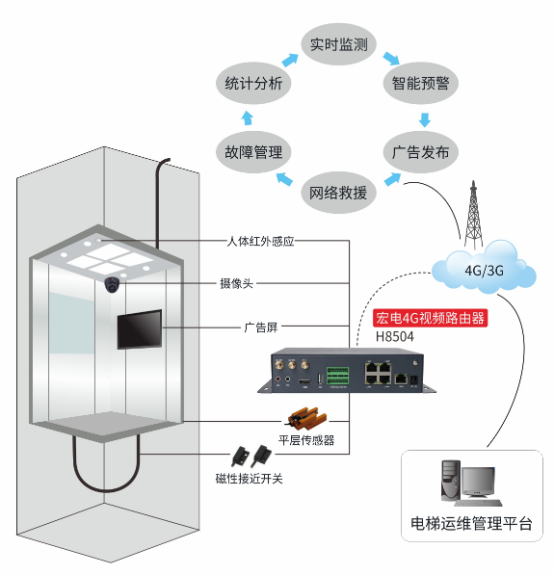 現(xiàn)場演示的電梯物聯(lián)網(wǎng)系統(tǒng)吸引行業(yè)觀眾駐足交流,該系統(tǒng)由電梯相關(guān)傳感器、宏電H8504 VTU 4G視頻路由器、廣告媒體發(fā)布平臺、電梯運維管理平臺組成,通過將電梯內(nèi)人體紅外感應(yīng)器、攝像頭、廣告屏、平層傳感器、磁性接近開關(guān)等接入到 4G視頻路由器,實現(xiàn)電梯運行速度、電梯負載、層數(shù)、開關(guān)門信息及時上傳到電梯運維管理平臺,維保部門、物業(yè)部門、質(zhì)監(jiān)部門能實時查看到電梯運行情況,監(jiān)控視屏遠程查看,一旦有危險情況,能通過GIS地圖定位到故障電梯,及時處理險情,同時對于廣告運營商而言,可以在廣告媒體發(fā)布平臺遠程更換公告。