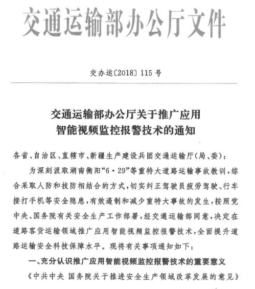 如何降低事故率,是政策層面一直在關注的問題。在2016年12月頒布的《中共中央國務院關于推進安全生產領域改革發展的意見》中,寫明生產安全事故責任入刑,以商用車作為重點監管對象的交通安全成為三大重點領域之一。2017年4月《營運客車安全技術條件》正式實施,明文要求“車長大于9米的客車,應裝備前撞預警系統(FCWS)及車道偏離預警系統(LDWS)”。2018年6月,交通運輸部辦公廳發布關于推廣應用智能視頻監控報警技術的通知,要求在既有三類以上班線客車、旅游包車、危險貨物道路運輸車輛、農村客運車輛、重型營運貨車上安裝智能視頻監控報警裝置,新進入道路運輸市場的“兩客一危”車輛前裝智能視頻監控報警裝置,實現對駕駛員不安全駕駛行為的自動識別和實時報警。
